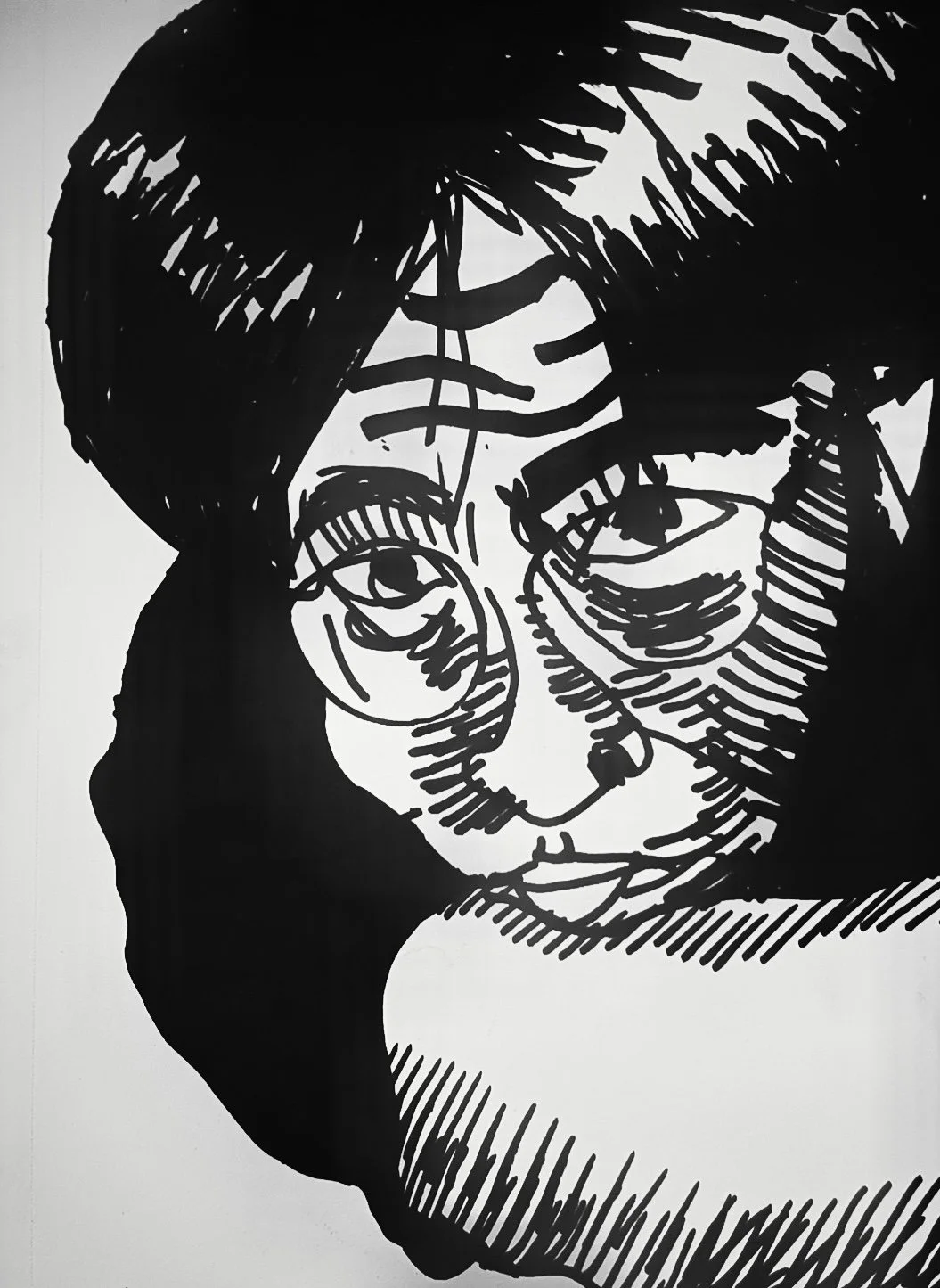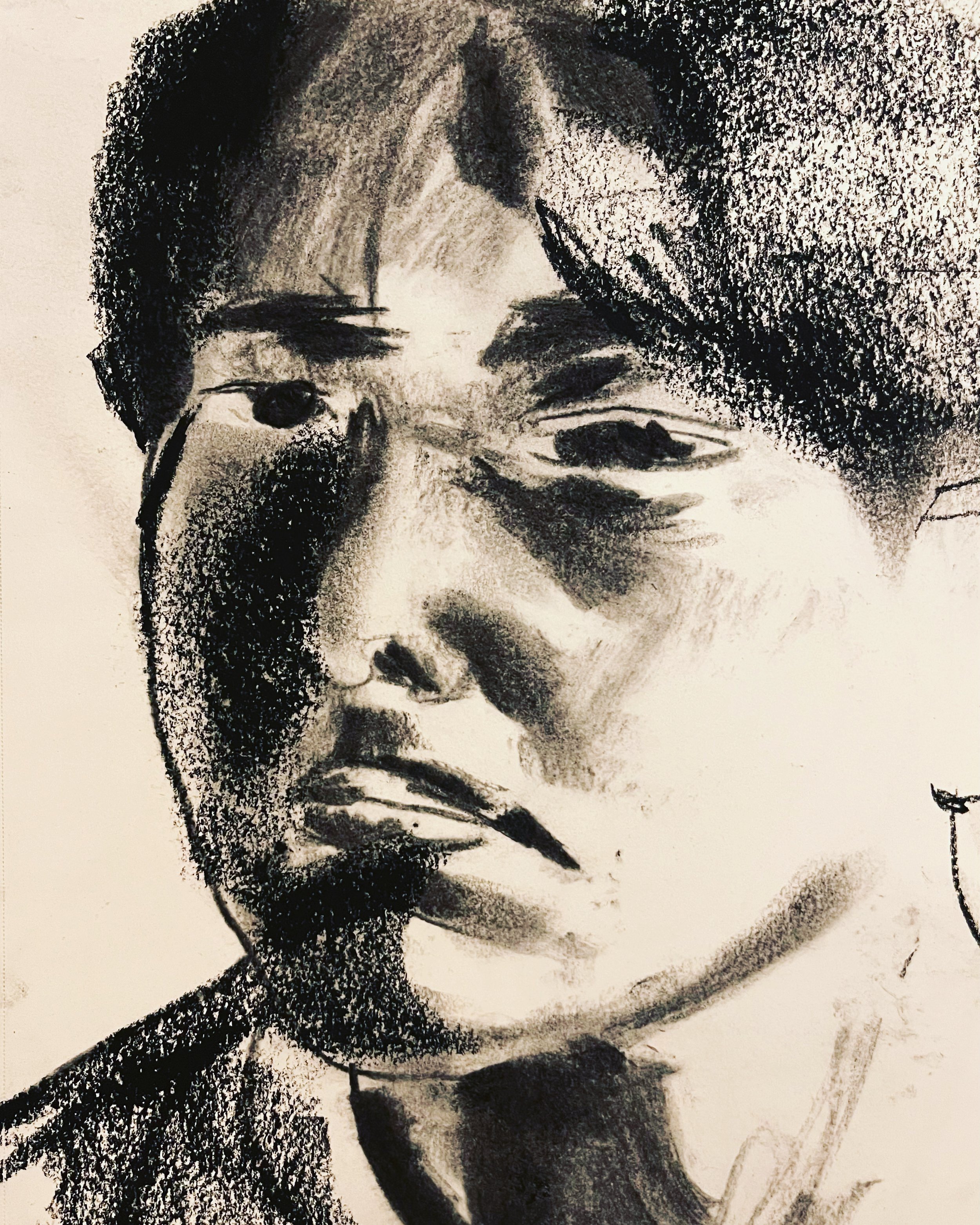 “Self-portraiture has always been one of my favorite subjects, offering a space for introspection and emotional exploration. In late 2023, I began creating a series of monotone self-portraits that delve into the physical pain and internal doubts I was grappling with at the time. These works, executed in charcoal and marker, capture moments of vulnerability, intoxication, physical pain, and the dialogue between my external and internal selves.”